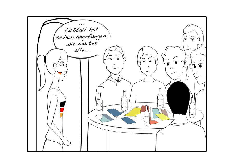 Die Konzeption erfolgte größtenteils im Team. Erst als es an die Details ging teilten wir uns auf: Ich zeichnete für alle drei Ideen die Storyboards, während Ramona und Anette die Dialoge für die Spots schrieben. Das Ergebnis waren halbanimierte Storyboards, die als Pitch vorgestellt wurden.