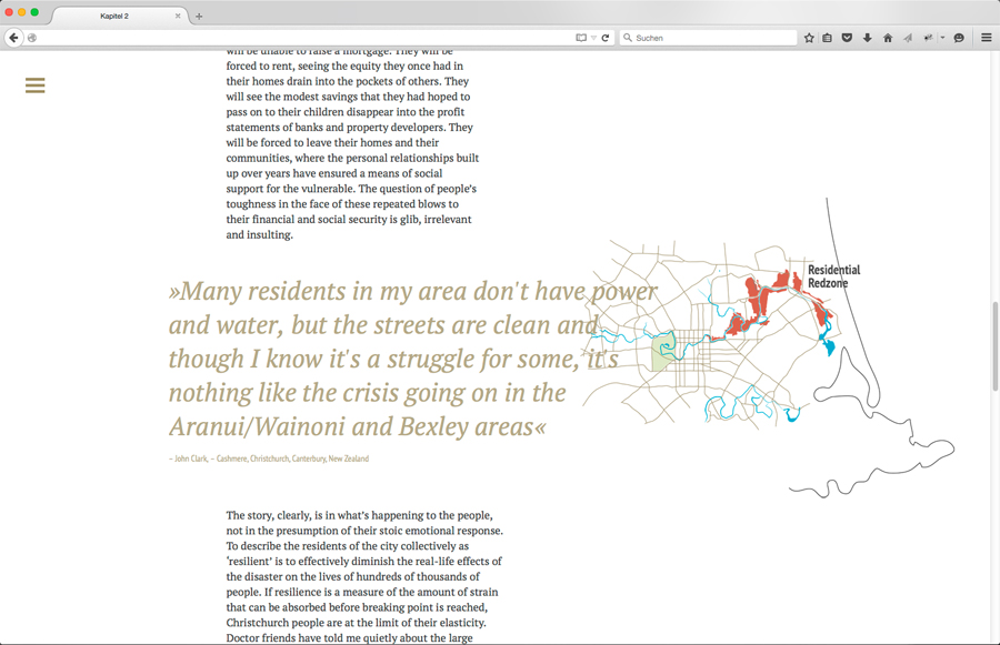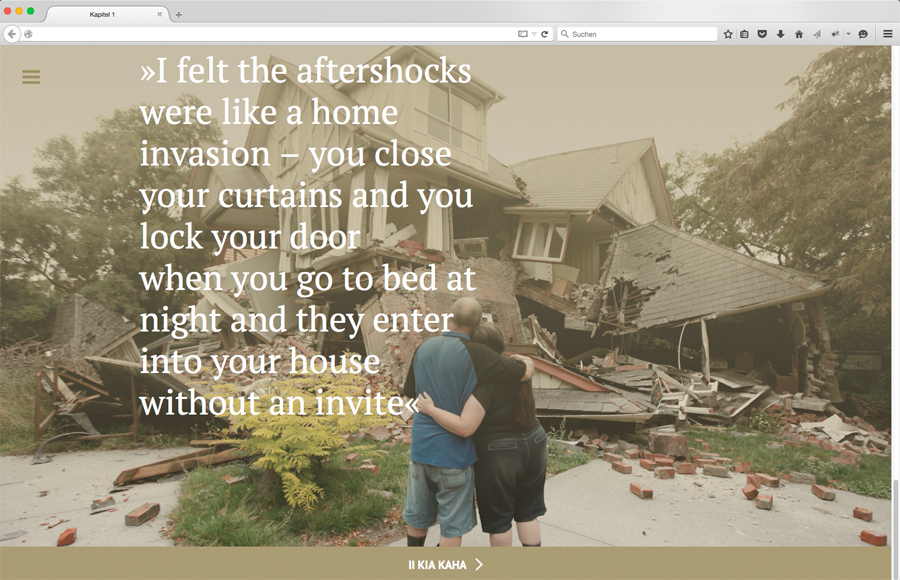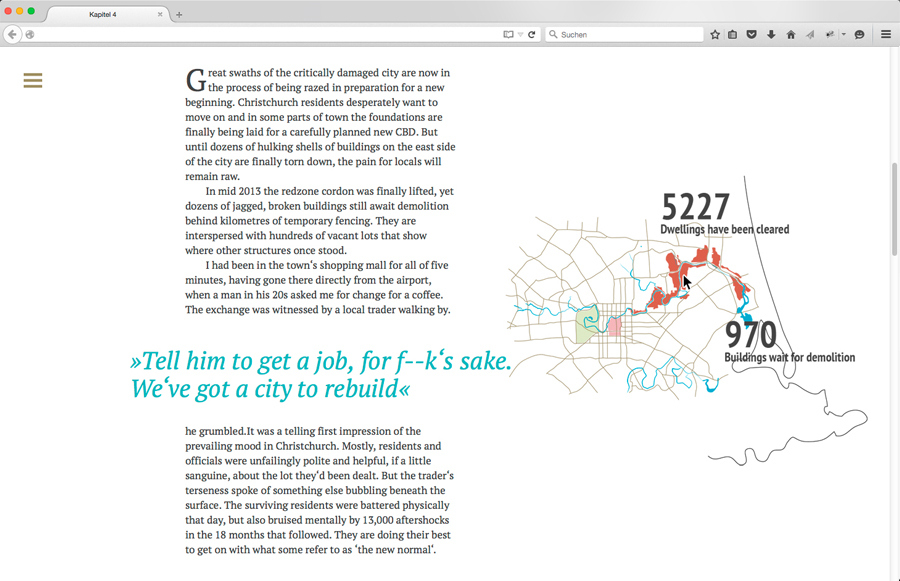 die wir in der Reportage aufarbeiten, sondern auch deren Kraft und durchaus pragmatische Einstellung, um Christchurch wieder aufzubauen.