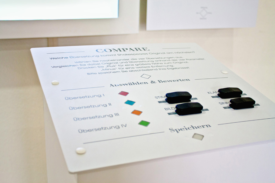 Shakespeares Sonette auf Deutsch? Unmöglich! Oder doch? Für mein Projekt entschied ich mich, den Besuchern der Ausstellung die Möglichkeit zu geben, selbst zu entscheiden. Anhand vier Parameter können die Anwender ihre Meinung abgeben, ob die deutschen Übersetzungen an Shakespeares Origanle heranreichen.