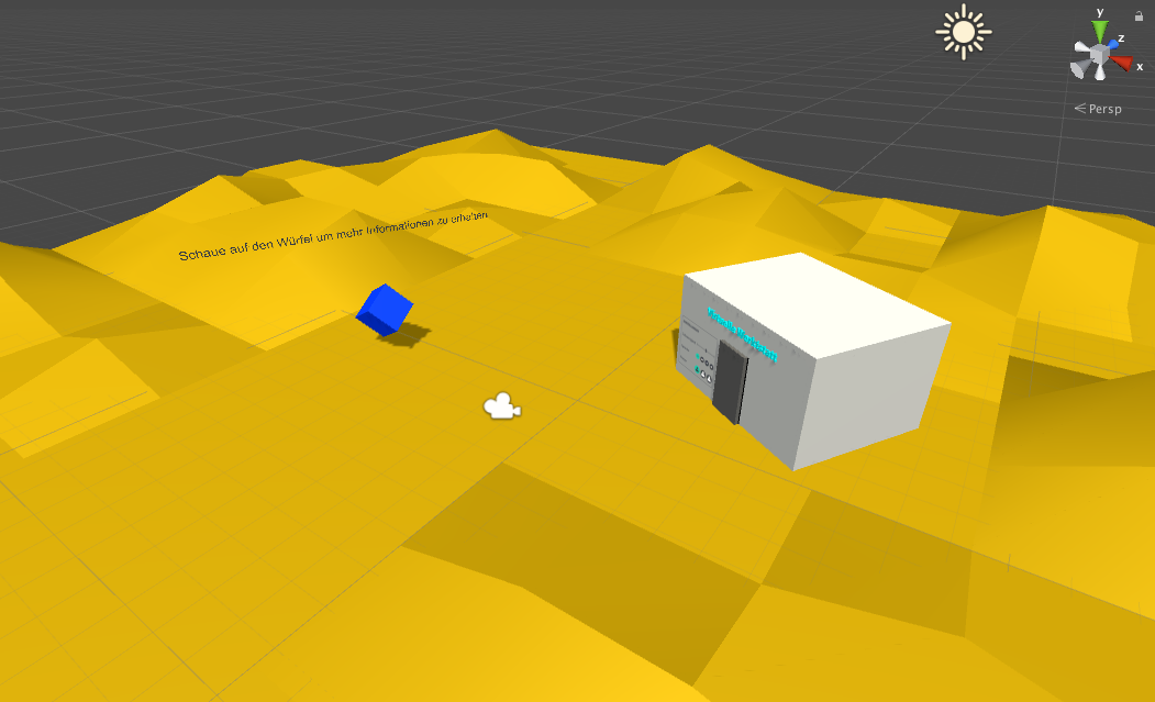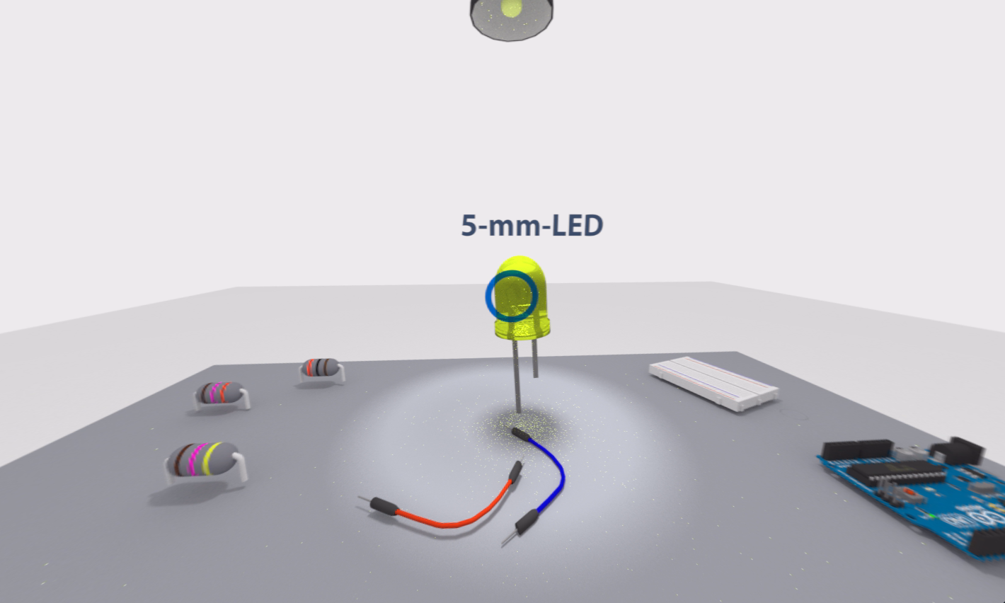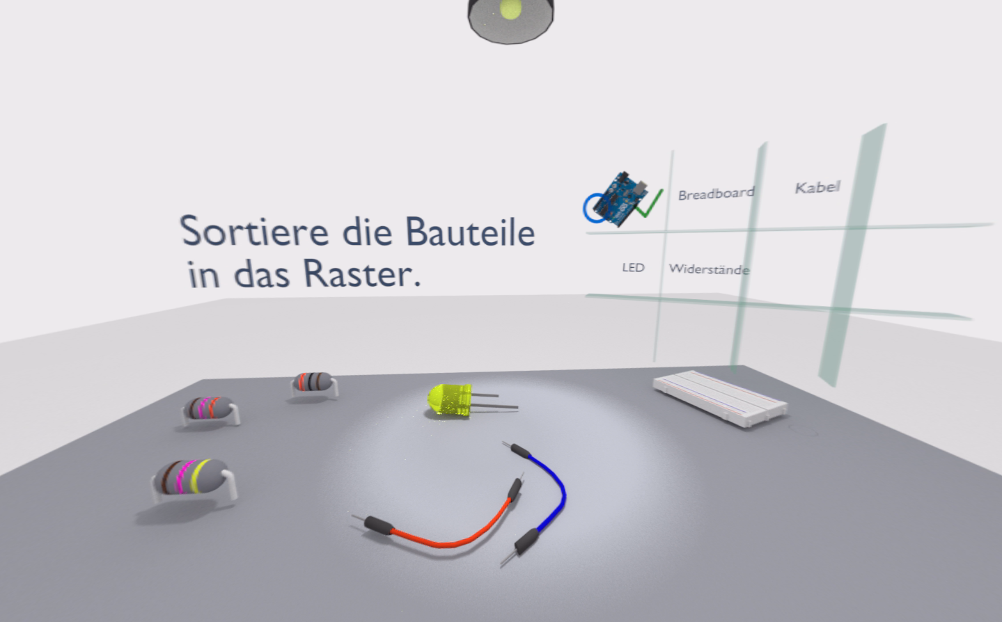 Nach der Recherche-Phase, die sowohl das Medium „Virtuelle realität“ als auch das „Instruktionsdesign“ umfasste, konzipierte ich eine virtuelle Lernumgebung für die Samsung GearVR. In den enstandenen drei Lektionen lernt der Nutzer sowohl die einzelnen Komponenten kennen als auch einfache Schaltungen mit LEDs und Widerständen zu bauen. Die Anwendung startet mit einer wüstenähnlichen Umgebungen. Hier kann sich der Nutzer zuerst einmal mit der VR vertraut machen und die Steuerung über das Touchpad der GearVR üben. Durch die Tür kann die Werkstatt betreten werden und somit die Lernanwendung gestartet werden. Die Werkstatt ist visuell sehr reduziert gehalten und gewährleistet so eine bessere Konzentration auf die Lerninhalte, die allesamt auf dem Schreibtisch stattfinden.